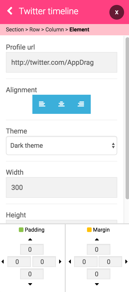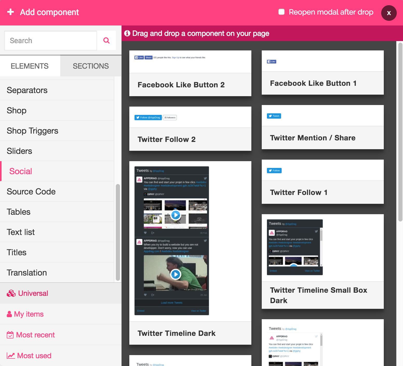 From breaking news and entertainment to sports, politics, and everyday interests, when it happens in the world, it happens on Twitter first. You can set up different sharing elements right on your AppDrag site to share your Twitter content on your site, or to help visitors share your site on their own Twitter page.